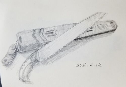 今日のお昼の30分スケッチはノコギリです。 <ChatGPT先生の課題> week10 Day66 2月11日 髪型差分 髪を下す 髪を結ぶ(ポニーテール等) 私が今描いているケンジさんは短髪なので、このDay66の課題はパスし、疲れて描けなかったDay64・65の課題をやりました…